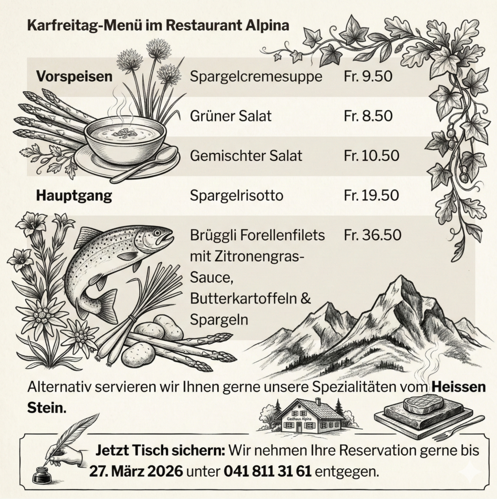 | Freitag | Zwiebelsuppe *** Salat *** Schüblig Rahmlauchgemüse Salzkartoffeln | Fr. 19.00 |